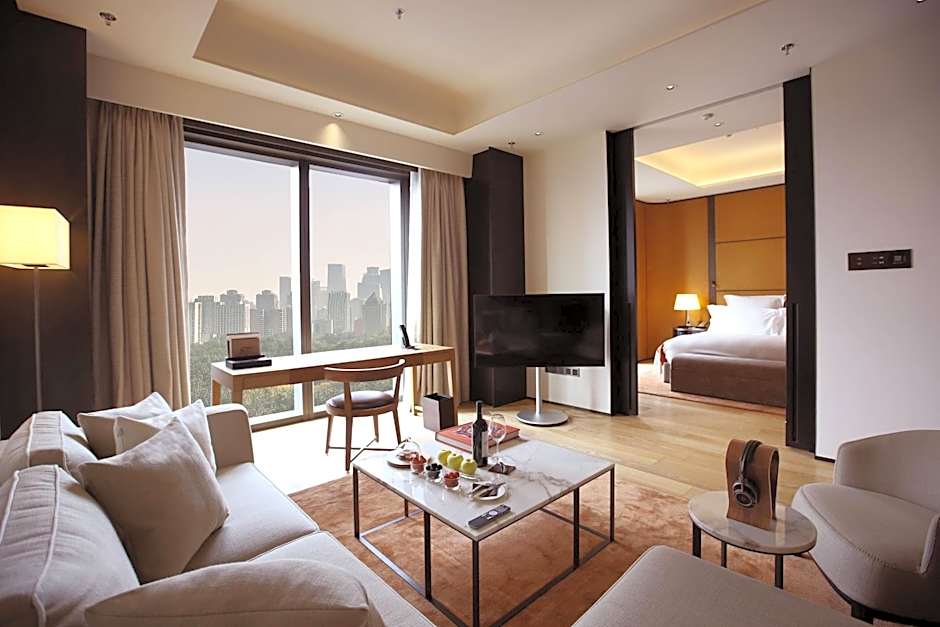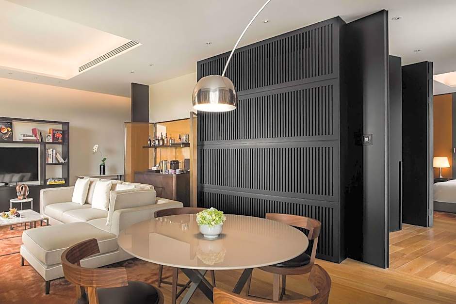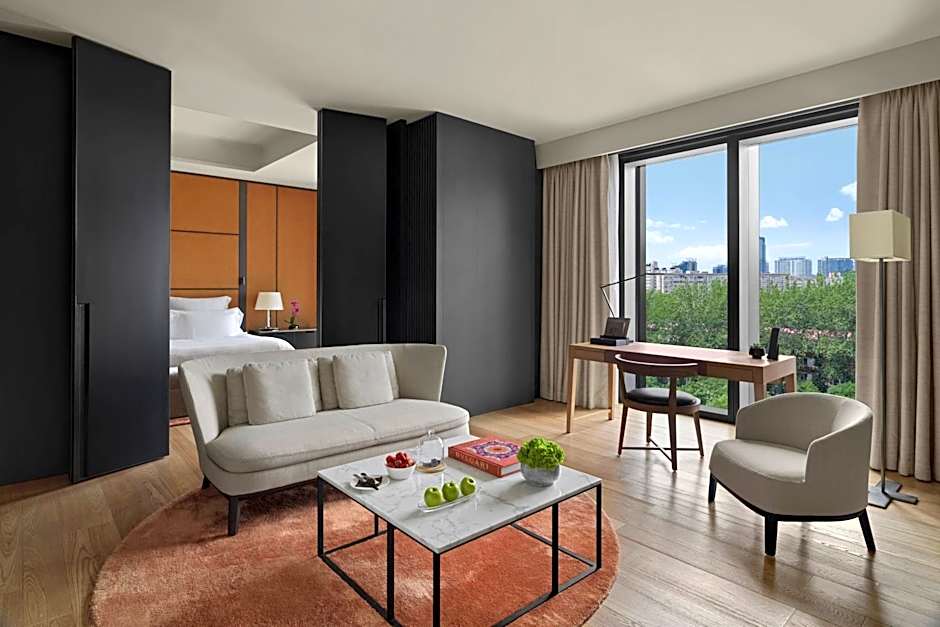 Overlooking Liangma River and Beijing skyline, the deluxe suites unfold in a sequence of ample spaces that include a living room furnished with custom-made elements of Italian design, a separate bedroom featuring a walk-in closet, and a bathroom coated in luminous white Navona travertine with black granite bathtub and shower. Each unit, with their distinctive features and unique individual touch, offers the feeling of a private residence. Size of the suite can vary from 102 to 121 square yards.